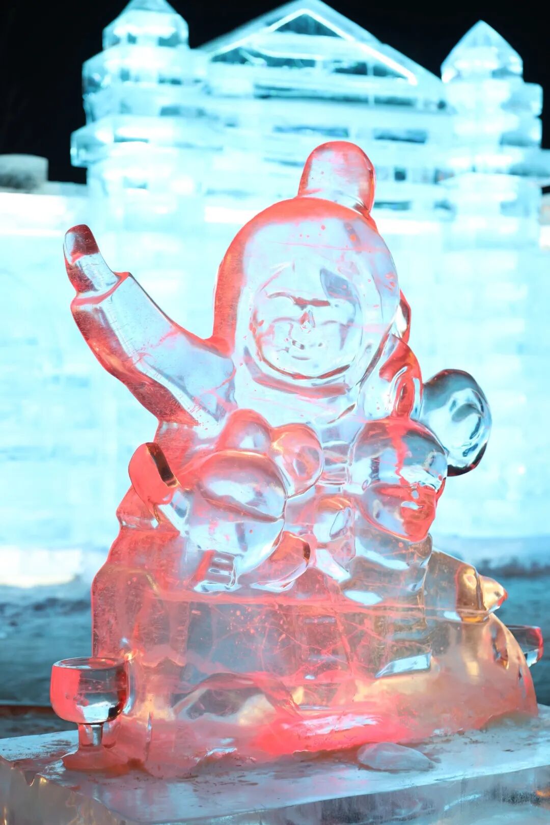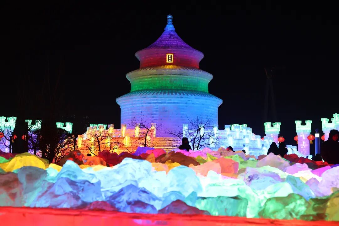 冰雕晶莹剔透,灯光璀璨如昼