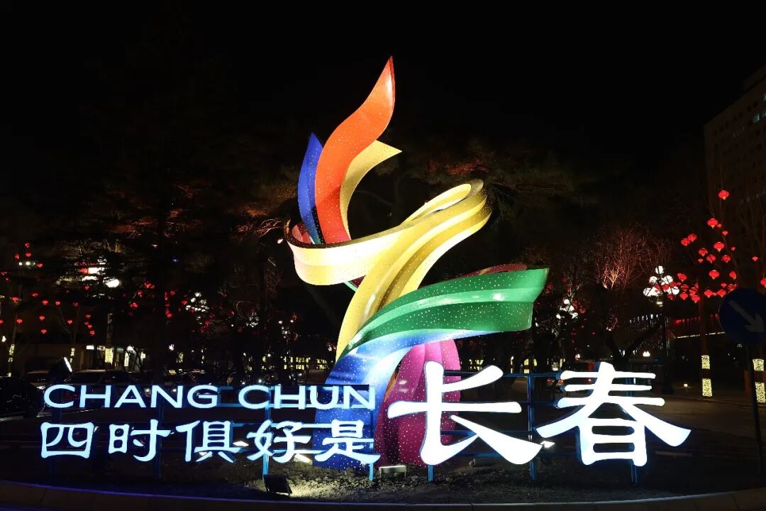 随路灯同步点亮,每日16:20-24:00。包含“走进朝阳 爱上长春”“温暖·巢·光·生”“新中国电影的摇篮”“国潮文化”“四时俱好是长春”。