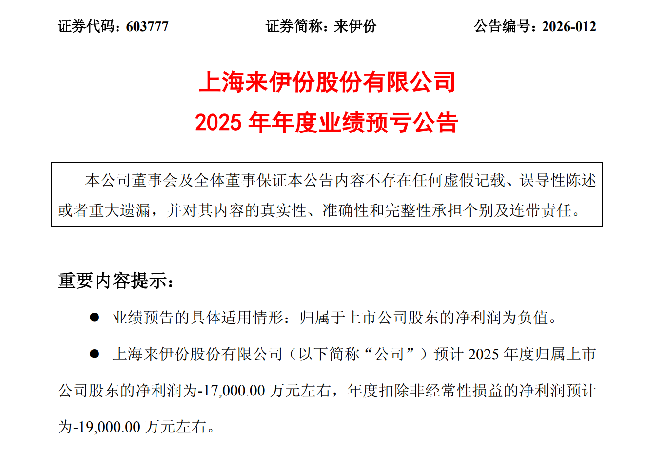 国内“休闲零食第一股”来伊份预计2025年净亏损1.7亿元左右。