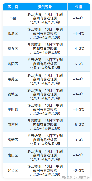 多云转阴,16日下午到夜间有雾或轻雾,北风3~4级阵风6级,最低气温市区-3℃左右,其他区县-6~-3℃,最高气温4℃左右。