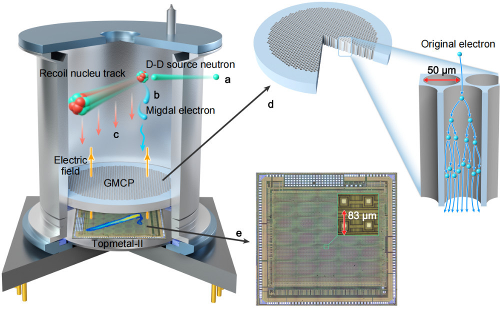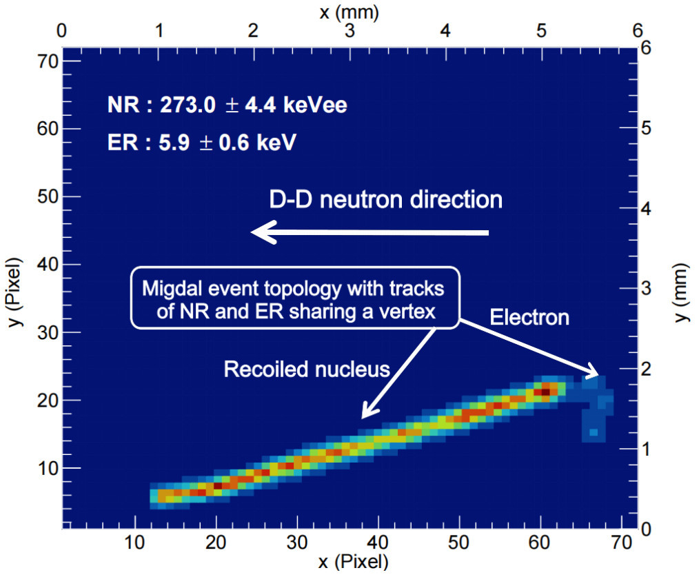 1939年苏联科学家阿尔卡季·米格达尔基于量子力学理论预言了“Migdal效应”米格达尔效应,即一个原子的原子核突然获得能量加速运动时,原子核在反冲过程中的内部电场变化将部分能量转移给原子核外电子,使电子有概率获得足够能量脱离原子束缚,形成“共顶点”的两条带电径迹(核反冲径迹和电子径迹)。近年来,“米格达尔(Migdal)效应”被认为是突破轻暗物质探测能量阈值的关键理论路径。自理论预言提出后的80多年间,中性粒子碰撞过程中的Migdal效应是否存在,一直未被实验直接观察和验证,这使得依赖该效应的暗物质探测实验,始终面临“理论假设缺乏实证支撑”的质疑。