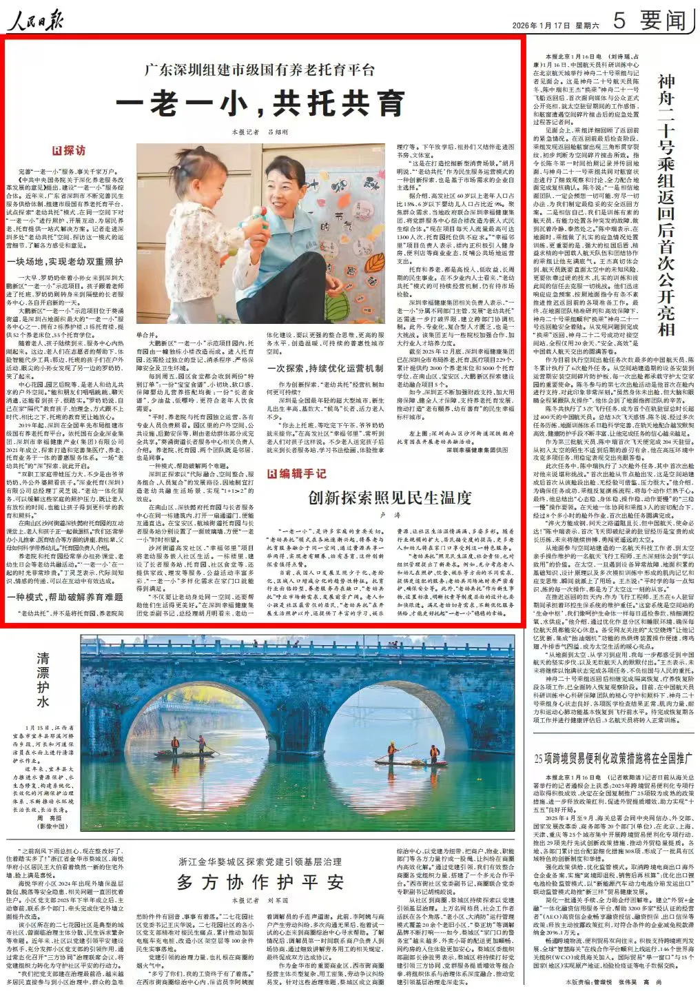 1月17日,《人民日报》在要闻版头条刊文《广东深圳组建市级国有养老托育平台 一老一小,共托共育》,关注深圳在全国率先探索的“老幼共托”服务新模式,并配发编辑手记《创新探索照见民生温度》。