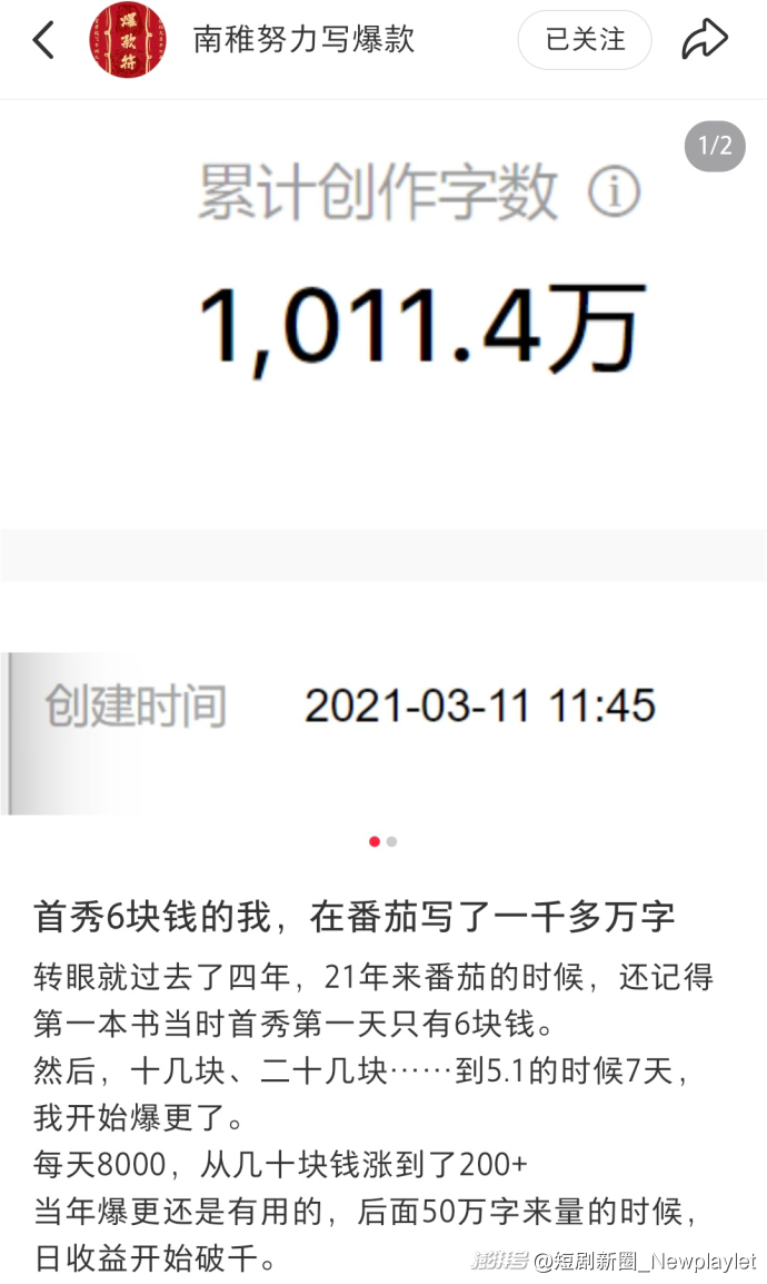 南稚是番茄小说作者,也是温州网络作家协会会员,还是浙江省网络作家协会会员。目前为止,她在番茄写了超过1011.4万字。2021年3月,她开始在番茄小说更新第一本书时,第一天收益只有6块钱,后面慢慢涨到每天200+,更新到50万字的时候,日收益开始破千。