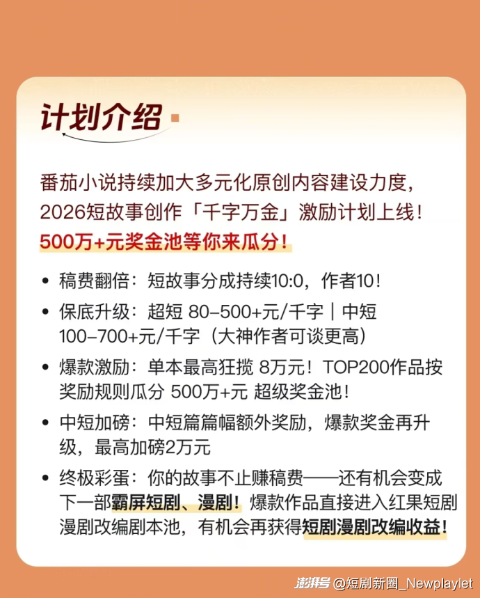 为了鼓励更多作者参与 IP 创作,番茄小说升级2026年度作家福利,针对小说短剧改编推出“爆款之源奖”和“优质原著奖”两项核心激励。