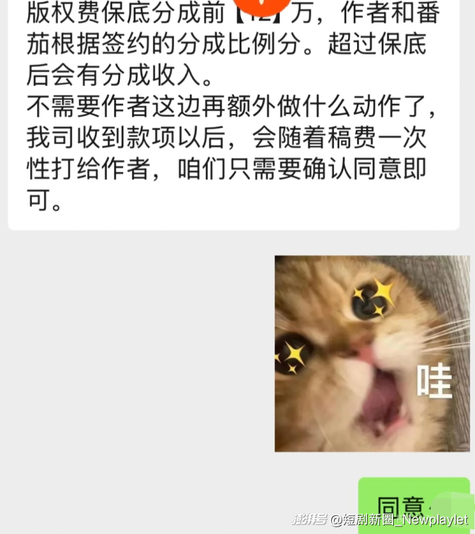 “宝,这本书红果参投有3个合作,辛苦看下是否同意售卖。版权费保底分成前12万,作者和番茄根据签约的分成比例分账,超过保底后会有分成收入。我司收到款项后,会随着稿费一次性打给作者。”