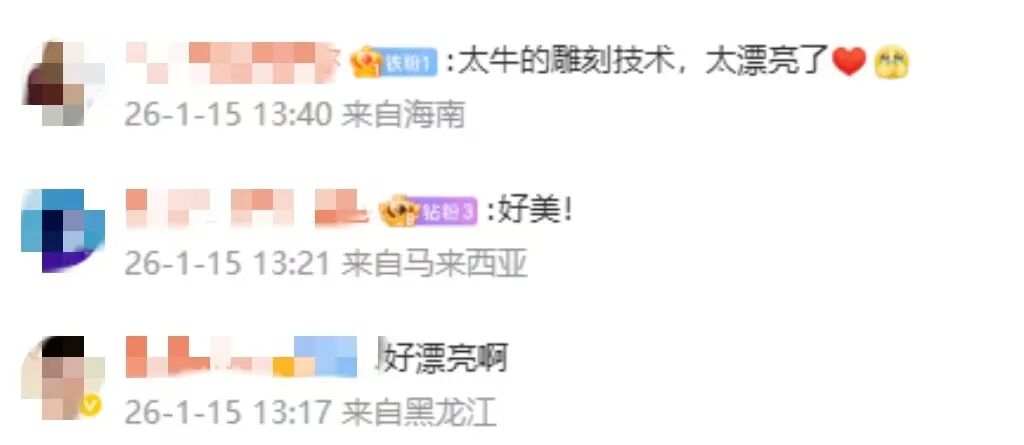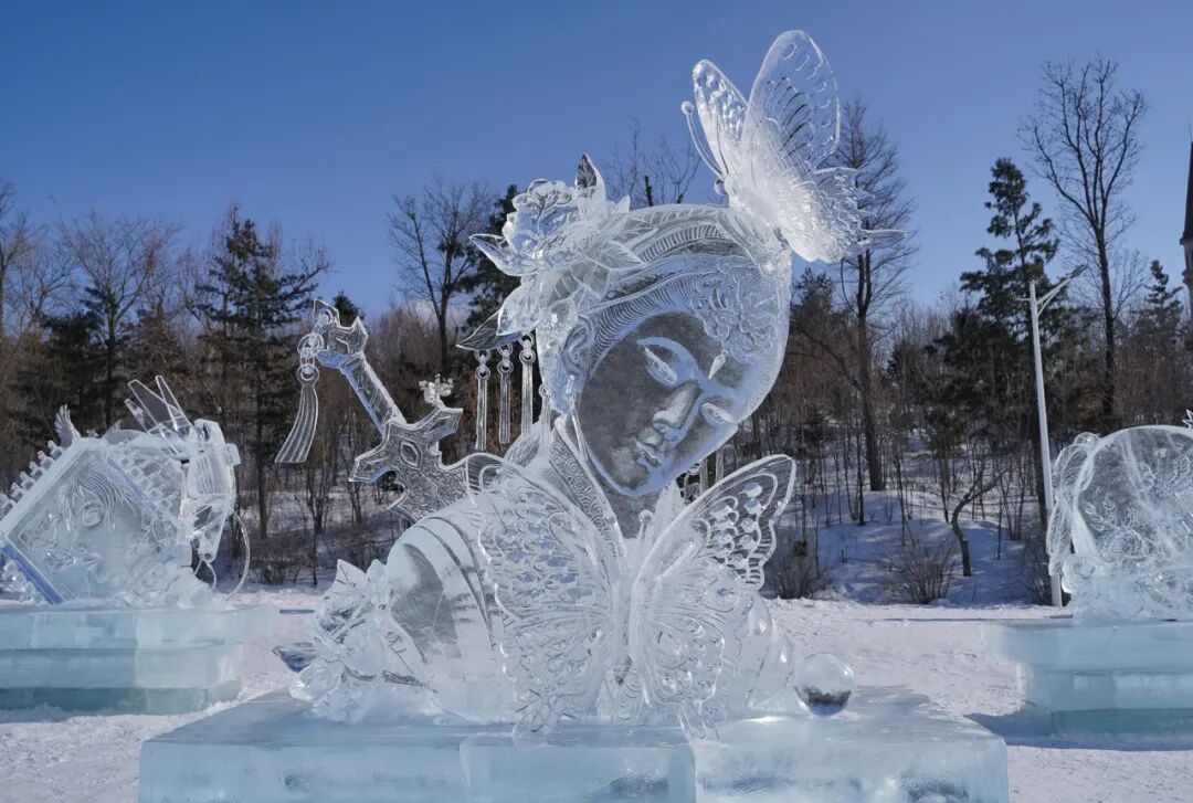 《花香蝶自来》堪称本届大赛“出圈之作”,匠人对细节的打磨近乎极致,冰雕上的耳环、配饰栩栩如生,发丝与衣袂的弧度流畅自然,就连头上的冰步摇都透着灵动雅致,微风吹来,随风摆动。
