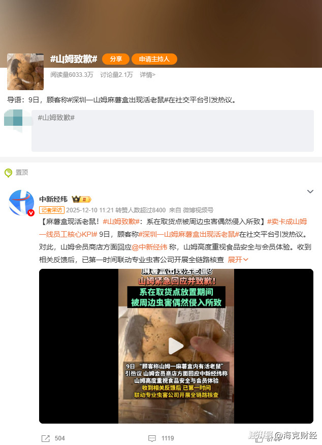 但与亮眼业绩形成鲜明对比的是,2025年山姆中国多次因为负面舆论登上热搜,比如2025年7月,因上架溜溜梅、好丽友派、卫龙辣条等普通商超都可以买到的商品,引得会员强烈不满;再如2025年11月,阿里前高管刘鹏跳槽沃尔玛中国,接任山姆CEO,恰逢山姆APP改版,网友炮轰山姆“大厂作风入侵”;再如2025年12月,有网友发帖称山姆极速达配送的麻薯盒里发现活体老鼠,密集炮火旋即袭来。