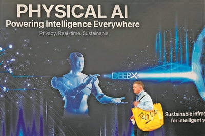 从制造业到医疗,从交通到家庭服务,物理AI正以前所未有的深度融入并赋能各行各业。图为一名男子在2026年美国拉斯维加斯消费电子展上走过印有物理AI字样的展台。新华社发(曾慧摄)