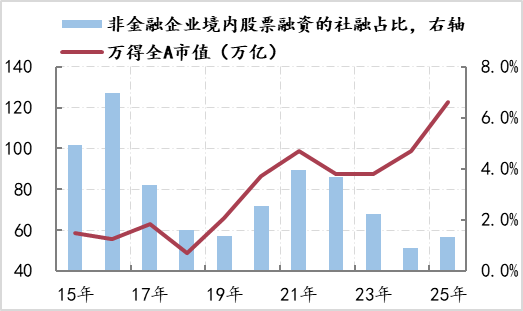 首先,A股反转且估值持续修复。“924”宏观政策转向后,市场出现了剧烈波动,并一度让市场人气低迷,年初DeepSeek的“出世”,让市场重新聚气,在科技牛与估值修复叙事的主导下,A股转入久违的牛市行情,至年底估值已升至123万亿,为2015年以来的最高水平。与此同时,2025年社会融资规模是35.6万亿,但其中非金融企业境内股票融资规模仅为4763亿,占社融比重仅1.34%,为2015年以来的次低水平。