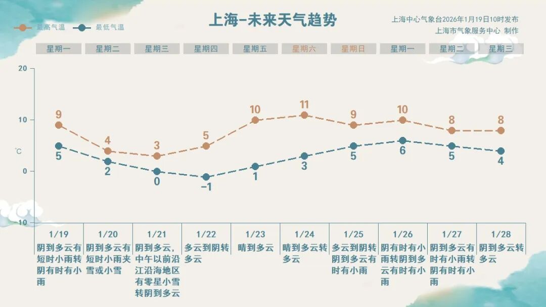 明天(1月20日),上海局部地区仍有短时小雨夹雪或小雪,周三中午以前沿江沿海地区有零星小雪,周三夜里转为阴到多云天气。受雨雪天气影响,部分路面和桥梁可能会出现轻微积雪和道路结冰现象,请注意出行安全。周二至周四上海将出现三天持续低温天气,最高气温在3~5℃;周四(22日)早晨将出现此次冷空气过程的极端最低气温,市区零下1℃左右,有薄冰,郊区零下6℃~零下3℃,有冰冻或严重冰冻。周四白天风力明显减弱,周五起以晴好天气为主,气温逐步回升。