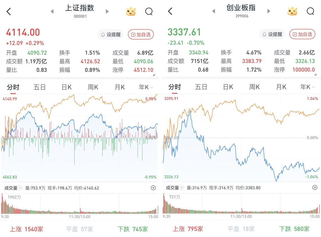 至收盘,上证综指涨0.29%,报4114点;科创50指数跌0.48%,报1506.86点;深证成指涨0.09%,报14294.05点;创业板指跌0.7%,报3337.61点。