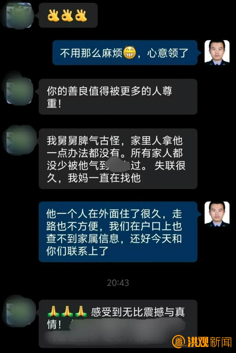 无意之中,民警在老人一部旧手机中找到了其海外亲属的联系方式,并主动与对方取得联系。原来,老人与姐姐失联多年,家人虽日夜牵挂却始终束手无策。得知老人已被妥善安置后,远在万里的侄女激动不已:“家里人拿他一点办法都没有……这次,我感受到无比震撼与真情,这种真情是在异国他乡所感受不到的……你的善良值得被更多人尊重!”一句来自海外的真挚感谢,是对基层民警工作的最好肯定。