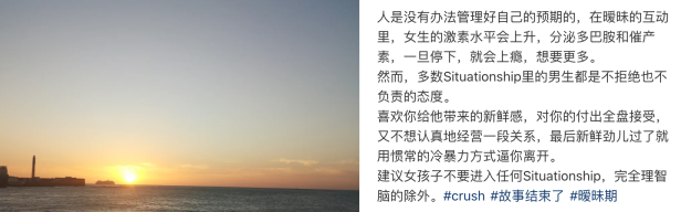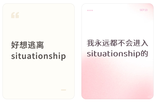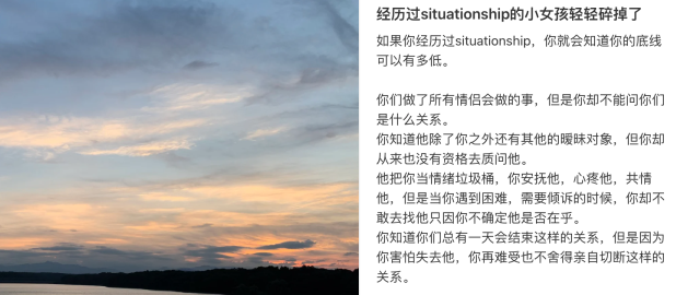 约会软件上刷到的人,聊得好好的突然问:「接不接受situationship?」一上社交平台,很多帖子激情讨论:女生应不应该谈situationship?怎么放下一段situationship?