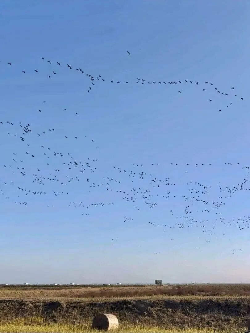 这些被网友亲切称为“瑞士卷”的草垛,本是农耕生活的寻常一景,却因与天上鸟浪的同框,产生了奇妙的化学反应。