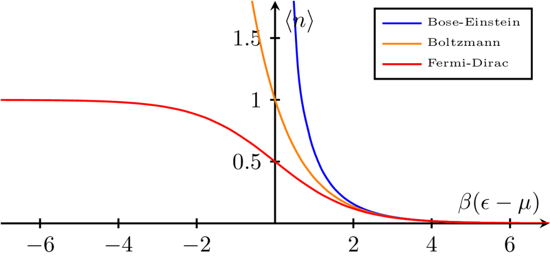 图3 平均占据数 ⟨n⟩ 与 β(ε−μ)的关系(β=1/kT,μ 为化学势):Bose-Einstein分布(蓝)显示低能级的强聚集趋势,Fermi-Dirac分布(红)受泡利不相容限制,Maxwell-Boltzmann分布(橙)给出经典稀薄极限。