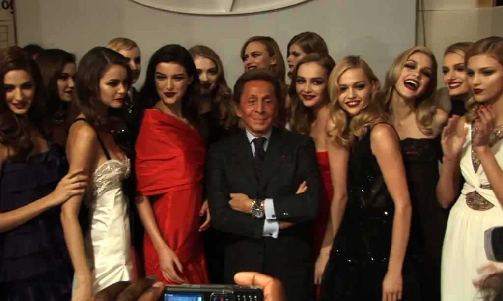 纪录片《华伦天奴:最后的皇帝》(2008)中的一幕:华伦天奴·加拉瓦尼(中)与其时装秀上的模特合影。