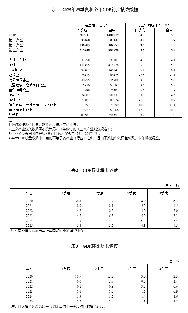 根据有关基础资料和国内生产总值(GDP)核算方法,经初步核算,我国2025年四季度和全年GDP核算结果如下。