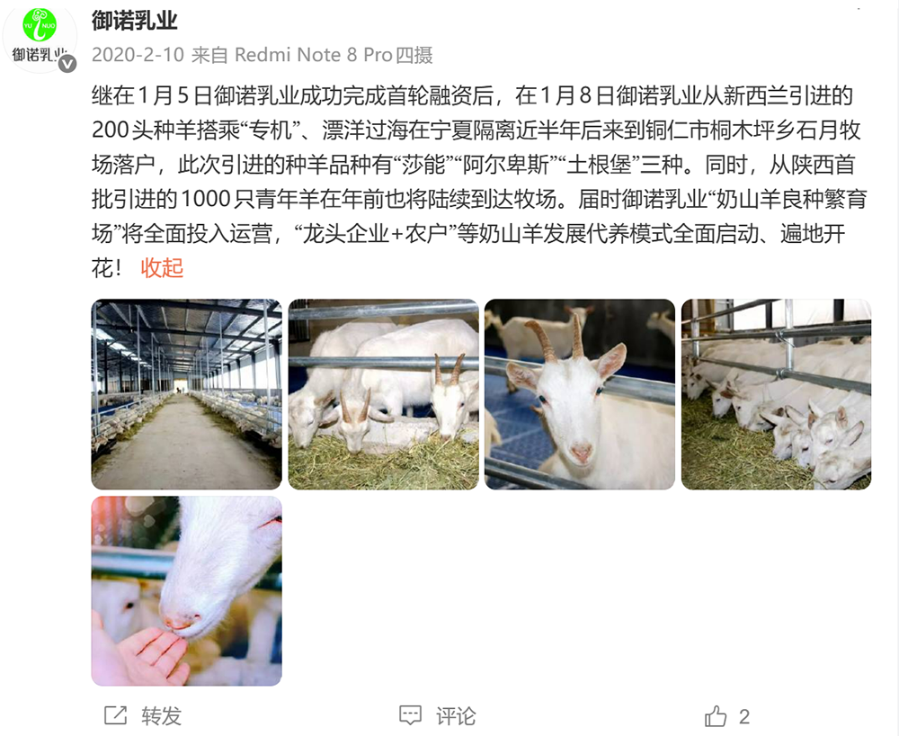 2019年4月,御诺乳业总经理张源在贵州本地媒体上介绍,公司铜仁项目总投资7.16亿元,将建3000亩青贮玉米基地、7000只奶山羊种羊示范场,以及2万吨婴配奶粉、10万吨液态奶生产线;达产后预计产值 30 亿元、利税超5亿元,建成国内最大羊乳综合加工基地。彼时,液态奶生产设备已完成试生产。作为公司董事长曹曦在这篇报道中宣称,御诺乳业羊乳加工在国内处于领先地,在国内羊奶市场的份额可占20%。