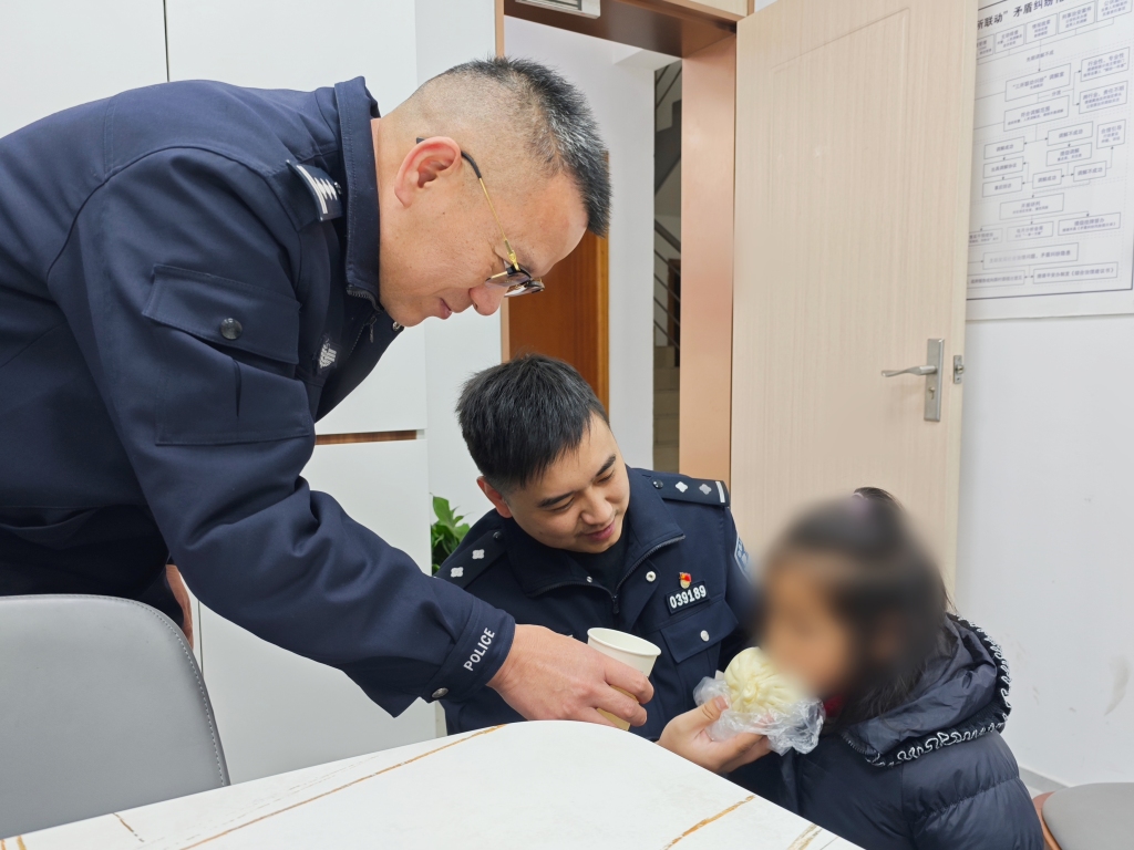 接到求助后,民警迅速赶赴现场。“当时她小手冻得通红,脚上什么也没穿,看得人心里一紧。”据民警回忆道,当时小女孩衣着单薄,浑身不停地在颤抖。没有任何犹豫,民警立即脱下自己的内胆外套,披在小女孩的身上。由于她年龄尚小,无法说清家庭住址,询问周边邻居后也暂无有效信息,民警便先将其带回派出所安置。回到大桥派出所后,民警为她端来热水,买来热气腾腾的肉包,一边轻声安抚小女孩,一边抓紧联系其家人。