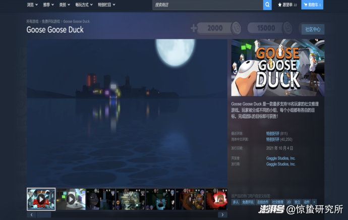 但在惊蛰研究所看来,《鹅鸭杀》开年爆火的市场反应着实有些令人意外。主要原因在于其玩法并非原创,甚至与狼人杀十分相似:玩家分为好人阵营(鹅)、坏人阵营(鸭)和中立阵营,目标不同,互不相帮,通过会议讨论、推理辩论票出他人,使自身所处阵营获胜。