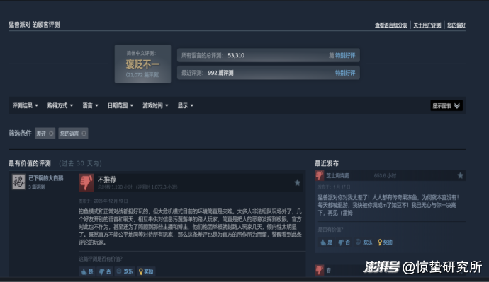 然而在销量与在线人数屡创佳绩的同时,《猛兽派对》却面临着各种差评困扰。在Steam平台,《猛兽派对》整体评价等级为“褒贬不一”。而两年后的今天,再看《猛兽派对》的在线人数,数据仅维持在巅峰时期的十分之一左右(根据小黑盒数据,2026年1月其平均在线人数仅为16108)。