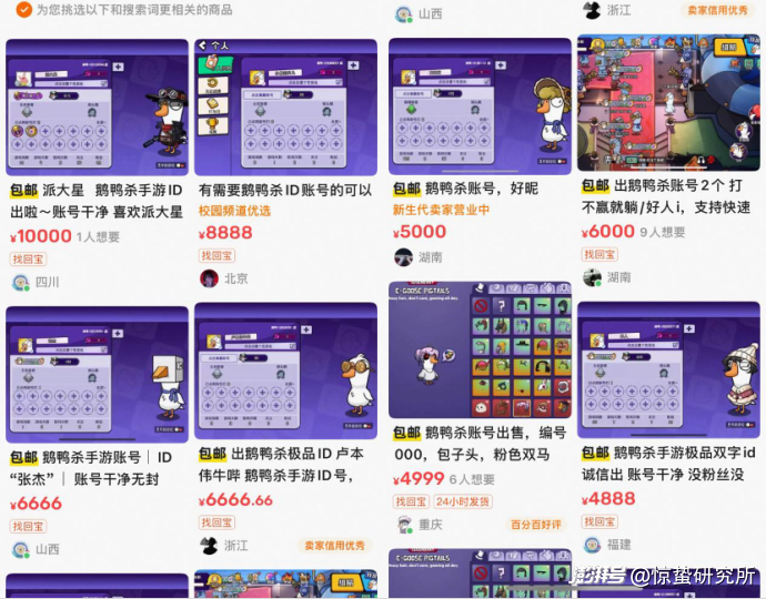 更值得警惕的是,这款手游从公测之初就暴露出诸多问题。惊蛰研究所观察到,《鹅鸭杀》手游公测首日便出现“天价ID”的现象,闲鱼平台的挂单价区间从1元跨度至万元不等。另外,一款名为“中学校服鸭”的角色装扮,因为给动物加上了明显的人类女性特征,也延伸出接连引发玩家争议的“建模问题”。而这些伴随游戏大火出现的种种乱象,无疑在社交媒体的舆论层面为游戏的持续扩圈造成了显著障碍。如果处理不当,即便《鹅鸭杀》迎来第二次热度爆发,恐怕也只是转瞬即逝的烟火,难以实现长效发展。