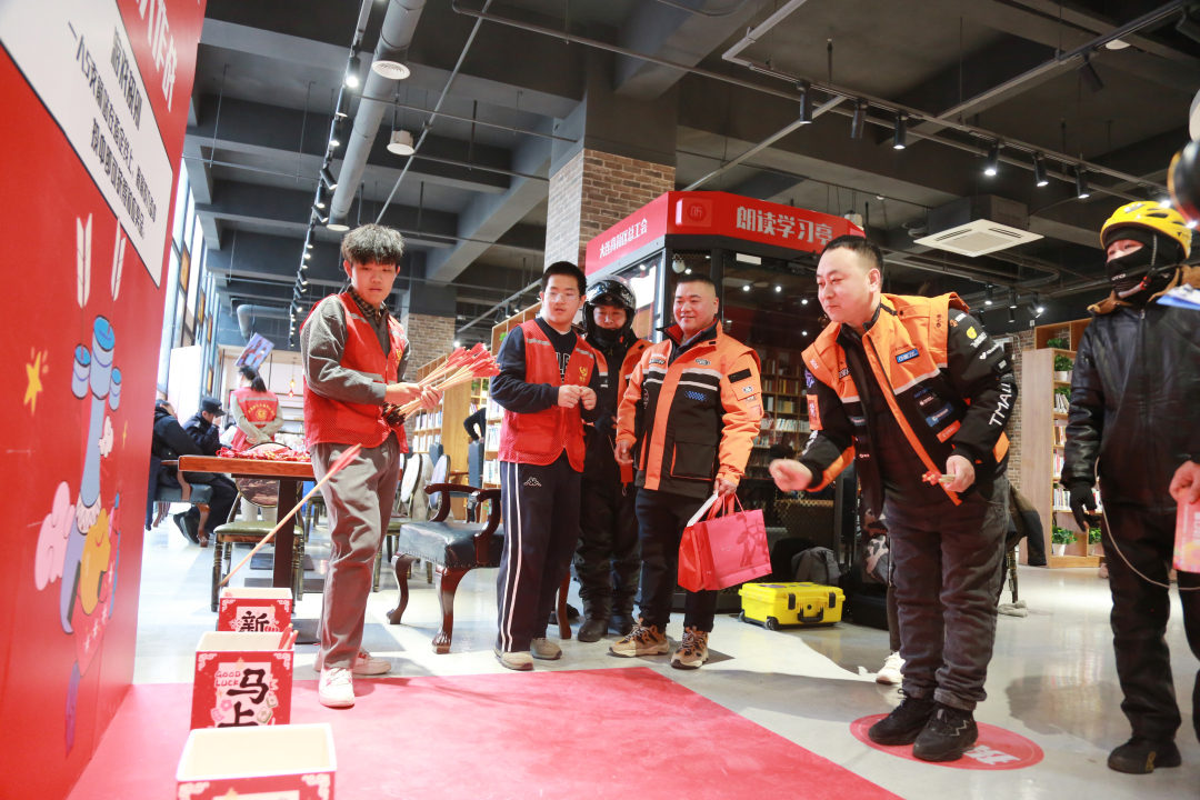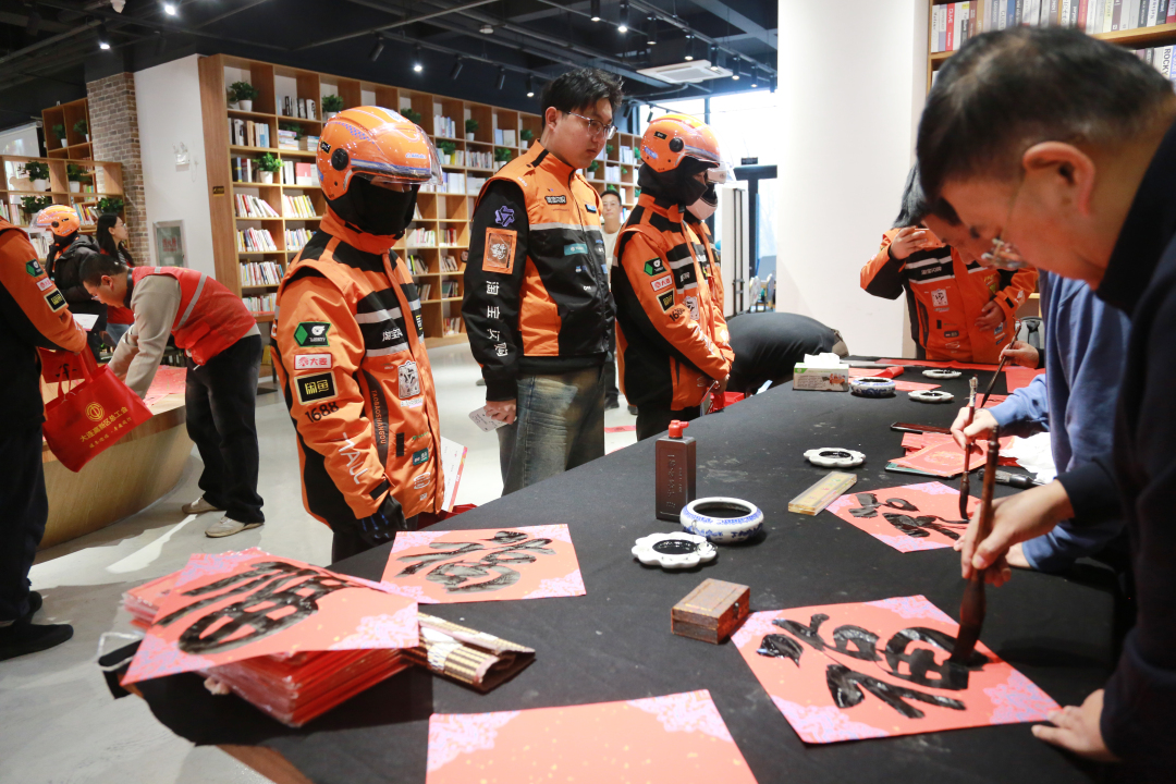 活动不仅提供实用服务,更营造出浓厚的节日氛围。在"翰墨迎春"区,大连市甲骨文学会的书法家们现场挥毫泼墨,为骑手们书写春联;"甜蜜时光"美食区里,冰糖葫芦的酸甜与汤圆的香甜交织出浓浓年味;"欢乐时光"游戏区更是欢声笑语不断,"幸运大转盘""福气投壶"等互动游戏让骑手们在轻松愉悦中赢取骑行护具、新春福袋等实用礼品。这场活动以贴心服务和温馨氛围,真正将温暖送到了新就业群体的心间。