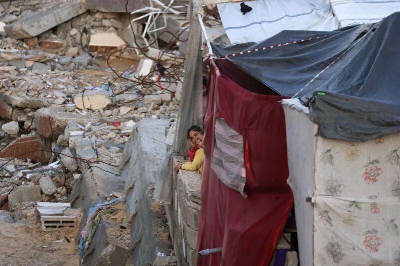 当地时间2026年1月16日,加沙城,巴勒斯坦儿童从帐篷中向外张望。 IC Photo
