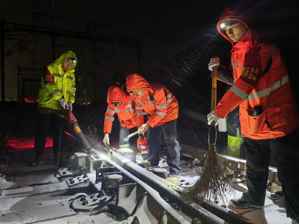 北沟东站位于徐州新沂市,是新长铁路上的一个四等小站。20日凌晨2点,雪花漫天飞舞,气温低至零下7度。新长工务段北沟东线路维修工区工长赵明带领6名职工,携带除雪工具对车站岔区扫雪除冰。道岔转辙部位关键接触面极易结冰夹雪,赵明俯身仔细检查道岔装置缝隙,先用扫帚清理表面积雪,对不易清理的部位,他摘掉厚手套徒手作业,指尖很快冻得通红。待车站南北两端6组道岔的积雪积冰被彻底清除,赵明和工友们已经在风雪中坚守了3个多小时。