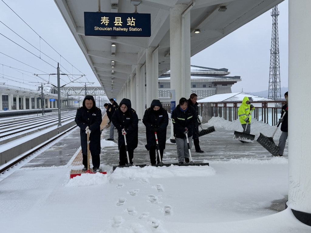 在安徽,淮北车务段迅速集结管内26支扫雪除冰突击队,面对极寒雨雪天气,240余名干部职工携带640余米防滑垫、1000余公斤工业盐、480余公斤防冻液奔赴一线,及时清扫站台、道岔等关键部位积雪积冰,在人行过道铺上防滑垫,并通过广播宣传、摆放安全提示牌等方式,提醒旅客注意安全,防止滑倒摔伤。阜阳北站出动扫雪人员442人次,清扫站前通道、天桥以及站台上的积雪、积冰,在进站口、地道等处铺设防滑垫76卷,并安排工作人员在进出站口、地道、天桥等处做好引导。合肥南、庐江西、淮南南、寿县等车站增派工作人员做好车票退改签工作,增加候车室空调机组的巡检维护频次,加强热水供应,为旅客提供舒适候车环境。