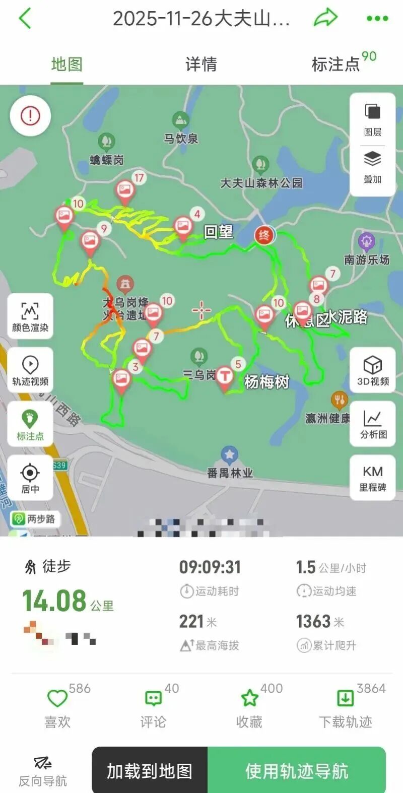 相关徒步App显示,该路线呈现为一匹“马”的形状,上传时间为2025年11月26日,全程14.08公里,上传者的运动耗时为9时9分31秒。截至1月16日,轨迹下载数已超过3800次。