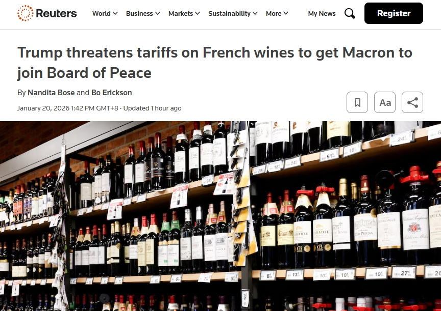 颇具戏剧性的是,在得知法国总统拒绝加入"和平委员会"后,美国总统特朗普随即在当地时间1月19日深夜宣布,将对法国葡萄酒和香槟征收200%的关税,试图以此胁迫马克龙改变立场。