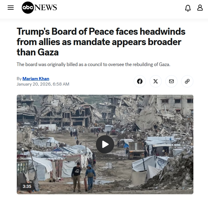 美国广播公司的报道直言,“和平委员会”面临来自盟友的阻力,因为授权范围似乎远超加沙地带。多个国家表示,它们最近几天收到了入会邀请,但这些国家的领导人似乎大都不愿发表公开声明,明确表示支持。