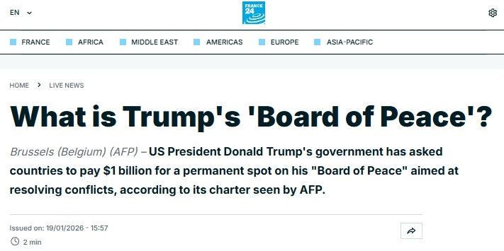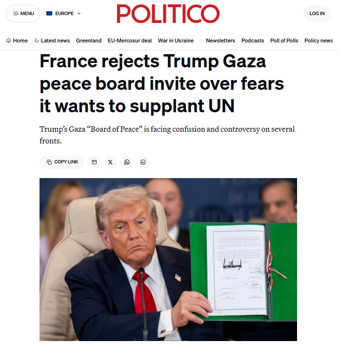 《政治报》网站19日报道,法国拒绝特朗普的加沙“和平委员会”邀请,担心它想取代联合国。