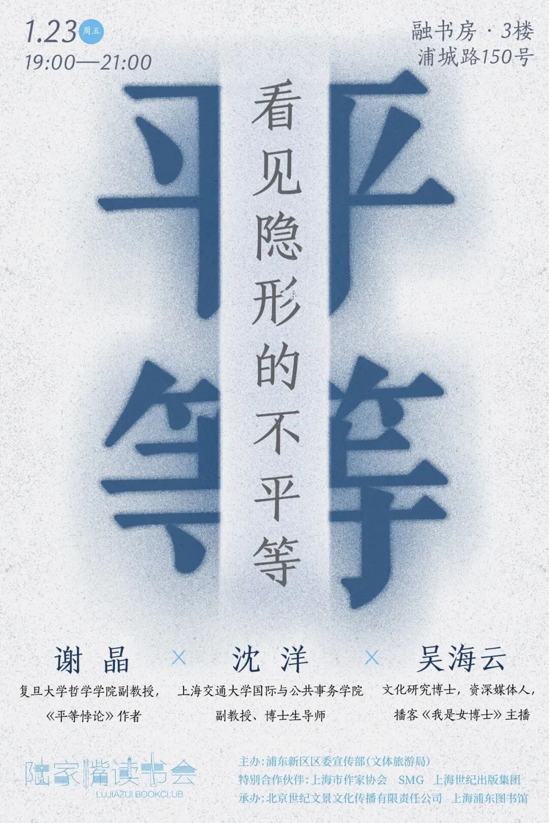 1月23日(周五)19:00—21:00,复旦大学哲学学院副教授、《平等悖论》作者谢晶,上海交通大学国际与公共事务学院副教授、博士生导师沈洋,以及资深媒体人、播客《我是女博士》主播吴海云将一起做客陆家嘴读书会,和读者一起重新审视那些支撑我们日常行动的根本观念,进一步看见那些被进步叙事掩盖的代价,看见那被日常习惯所麻痹的不公,并在此基础之上,探寻一种更诚实的共同生活的可能。
