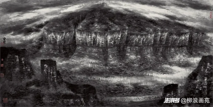 皴法选择:斧劈皴、折带皴、刮铁皴这类硬朗、能表现岩石劈裂感和坚硬质感的皴法最为常用。