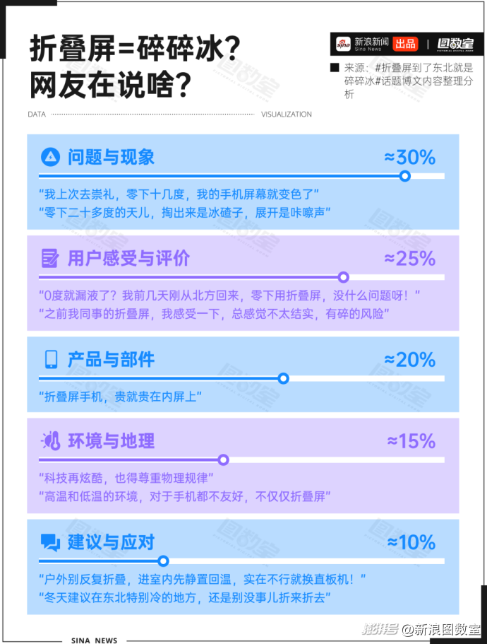 话题词下,网友们众说纷纭。有三分之一是现身说法的“经历派”,“零下二十多度的天儿,掏出来是冰碴子,展开是咔嚓声”;有25%的网友聚焦“感受与评价”,有人质疑“0度就漏液?”,也有人坦言“总觉得不太结实”;约20%的讨论指向“产品与部件”,强调“折叠屏手机,贵就贵在内屏上”。此外,还有理性科普的、出谋划策的。