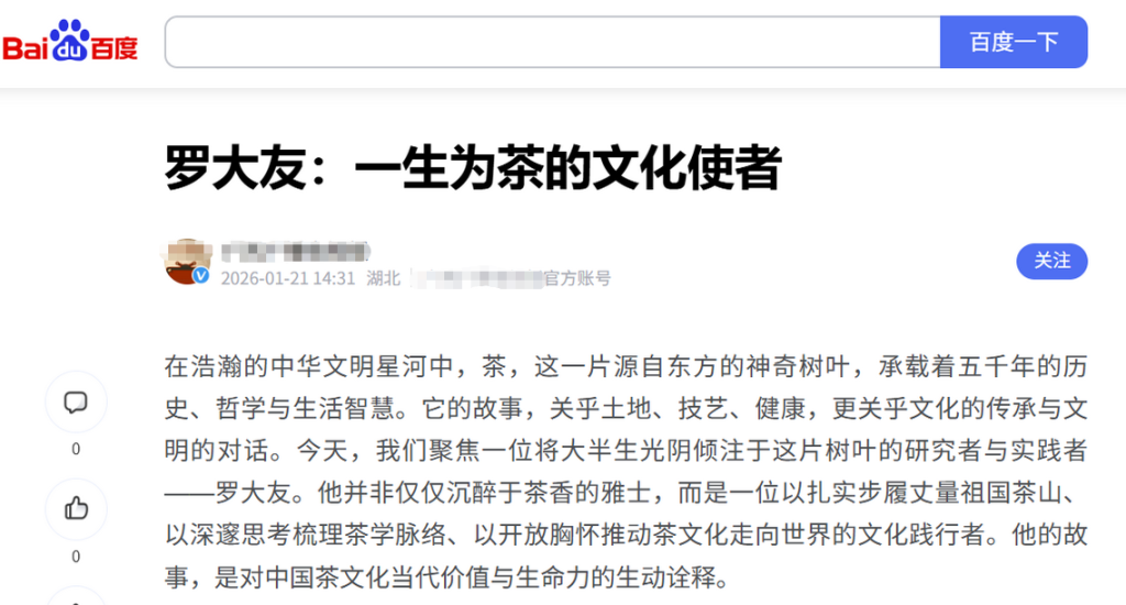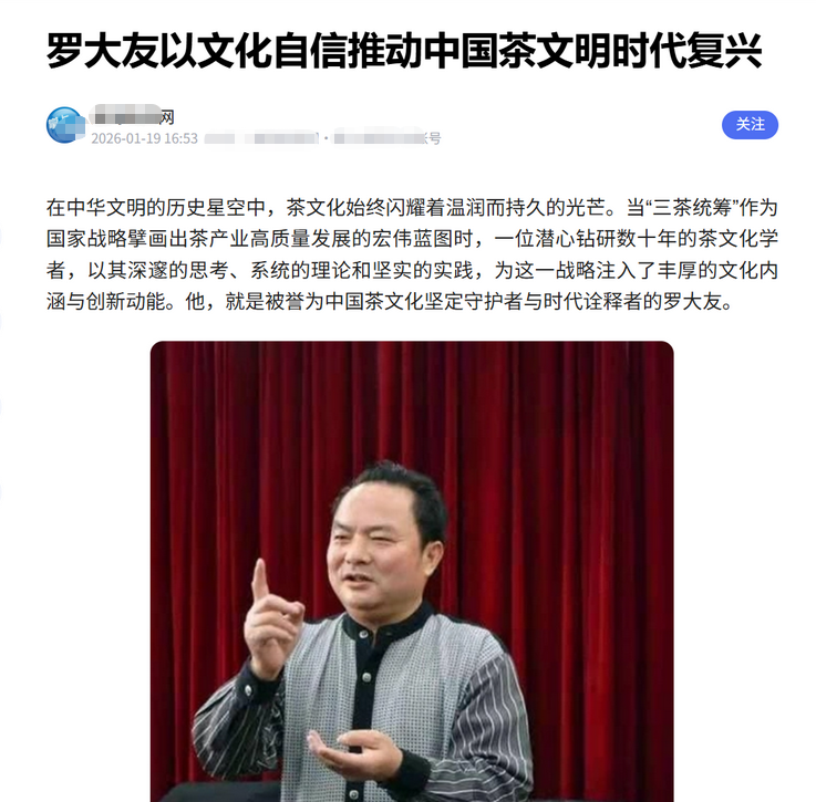 澎湃新闻发布“打假罗大友”系列报道之际,一篇题为《罗大友:一生为茶的文化使者》的文章于1月21日14时31分悄然刊发在某广播电视报的百度百家号上。