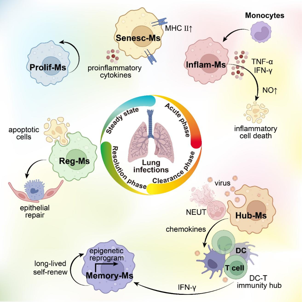 图2. 肺部感染不同阶段中巨噬细胞亚群的功能角色与动态变化
