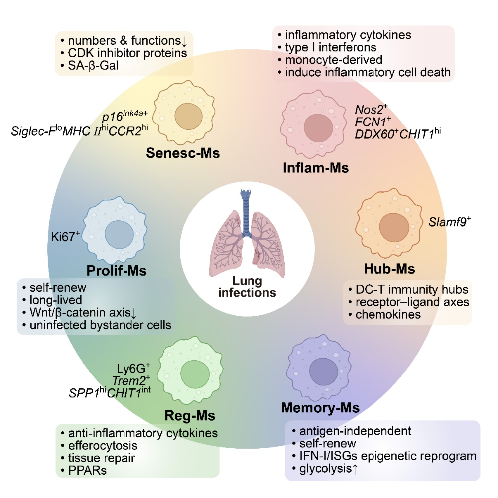 巨噬细胞是肺部感染中关键的先天免疫效应细胞,广泛参与病原体识别、炎症调控及组织修复过程。然而,长期以来,巨噬细胞被简单分为促炎与抑炎两类,这种二元模式逐渐显露局限,难以解释其在真实感染过程中呈现出的高度异质性与动态可塑性。近年来,单细胞测序、空间组学和谱系追踪技术的发展,为解析巨噬细胞在不同感染阶段、不同空间微环境中的状态变化提供了前所未有的分辨率。随着细胞注释类别急剧增加,目前研究高度依赖个别基因标记进行定义,命名体系分散、标准不统一、跨研究比较困难,也在一定程度上阻碍了生物学意义的整合。基于不断累积的单细胞证据,一个更贴近生理过程、以功能状态为核心的巨噬细胞分类框架逐渐形成,并推动研究从“静态标签式分类”向“理解动态连续谱系变化”转变。