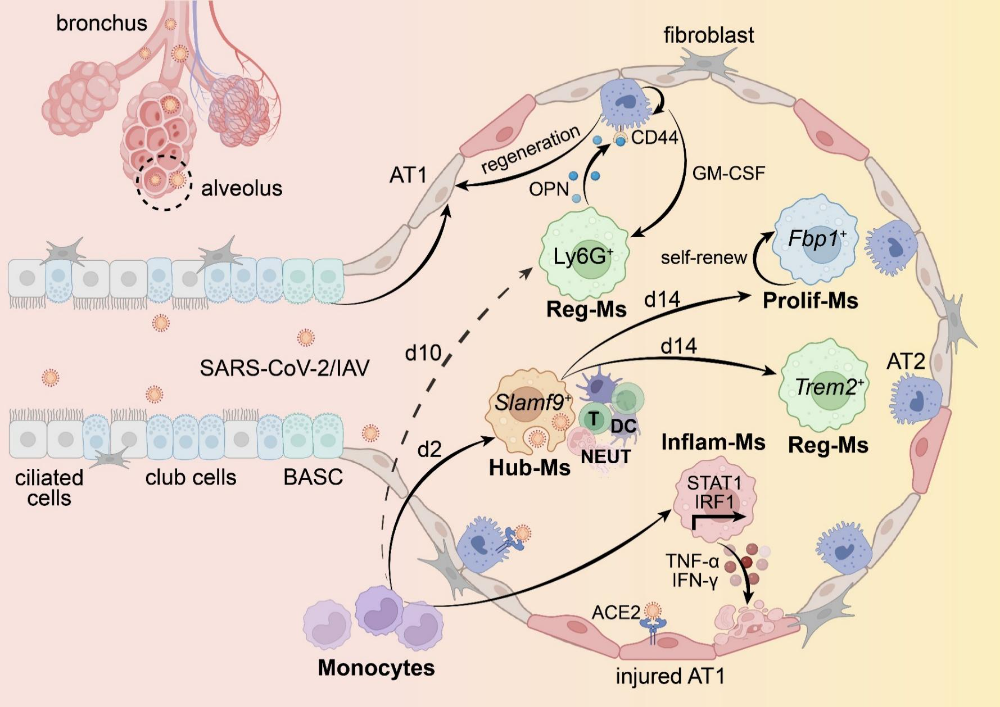 图3. SARS-CoV-2或流感病毒感染中肺泡微环境内巨噬细胞亚群的动态变化
