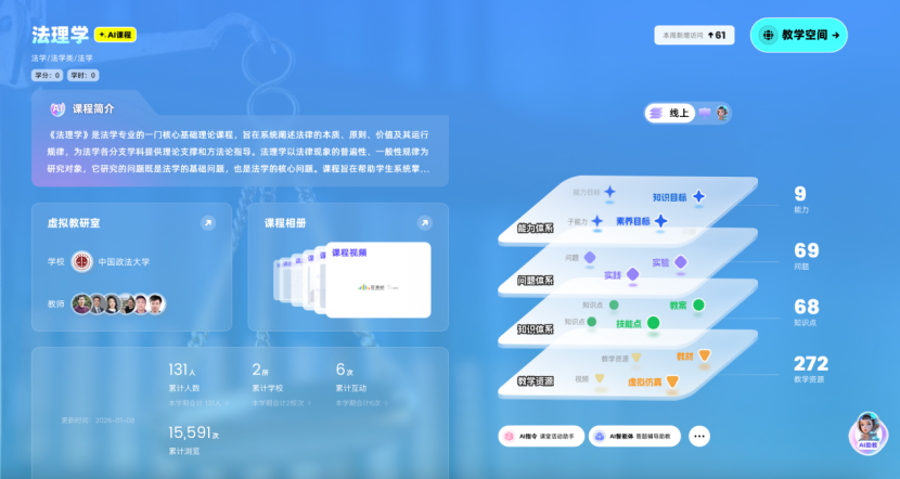为深入贯彻《教育强国建设规划纲要(2024—2035年)》精神,落实“推进教育数字化,建设全民终身学习的学习型社会”战略部署,中国政法大学依托深厚法学底蕴与顶尖师资团队,建设11门法学核心智慧课程,同步接入AI大模型与知识图谱技术。此次课程建设深度融合人工智能与法学教育,构建“人工智能+法学教育”创新范式,打造可视化的法律知识图谱与智能化教学闭环,为培养新时代德法兼修的复合型法治人才注入数字动能。