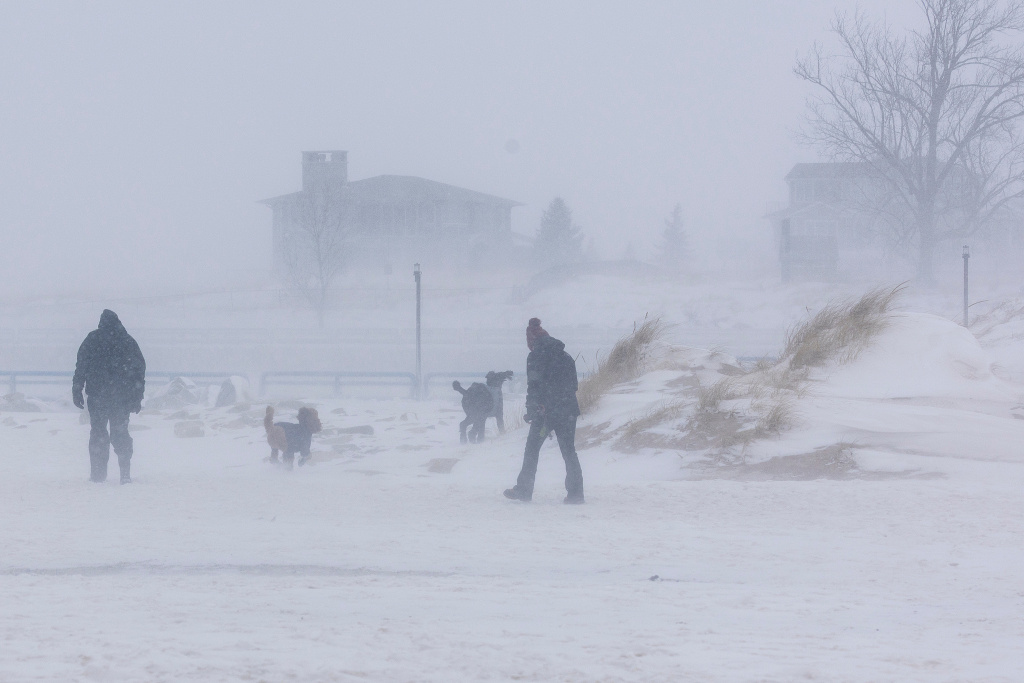 当地时间2026年1月19日,美国密歇根州遭遇暴雪天气,人们在大港州立公园遛狗。视觉中国 图