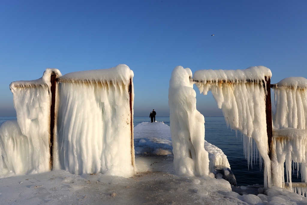 当地时间2026年1月20日,乌克兰敖德萨,寒潮来袭,海水结冰,人们站在冰冻的海滩堤岸上。视觉中国 图