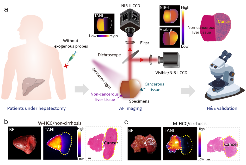 近日,复旦大学张凡/何海生团队联合附属华山医院钦伦秀/朱文伟团队,成功创制了一种无需注射任何造影剂的术中实时肿瘤边界可视化新技术,即组织自发荧光近红外成像技术(Tissue Autofluorescence NIR-II Imaging,TANI)。该技术通过利用组织内源性荧光物质在近红外二区(NIR-II,1000-1700 nm)的信号差异,实现了多种肝脏恶性肿瘤边界的清晰、高对比度可视化,并有效避免了血液和胆汁污染、肝硬化背景以及良性病灶带来的干扰。研究团队进一步于多例患者体内验证了该技术在外科手术导航中的应用潜力,为肝脏恶性肿瘤的精准切除提供了全新的临床辅助手段。