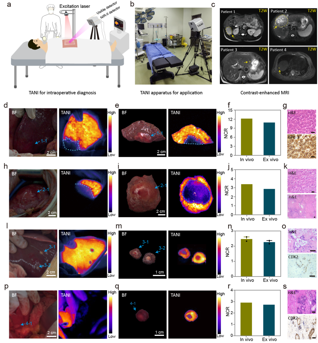 在获得伦理许可后,研究团队将TANI技术应用于真实术中场景,在多例肝切除手术中成功实现了对原发性肝细胞癌及多发结直肠癌肝转移灶的实时识别。在肿瘤切除完成后,TANI还可用于对手术切缘进行快速扫描,辅助判断是否存在残余肿瘤组织,为实现“精准切除、降低复发风险”提供了重要支持。术后病理检查结果与术中成像高度一致,进一步验证了该技术的临床可靠性。