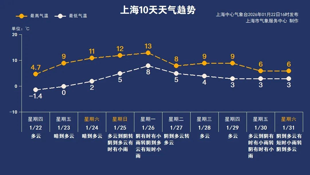 据“上海天气发布”微信公众号消息,今天(1月22日)早晨全市最低气温都在冰点以下,崇明站-4.0℃全市最低。白天晴到多云,阳光虽然在线,但并不暖和,全市最高气温多在4、5℃上下,其中市区徐家汇站4.7℃。