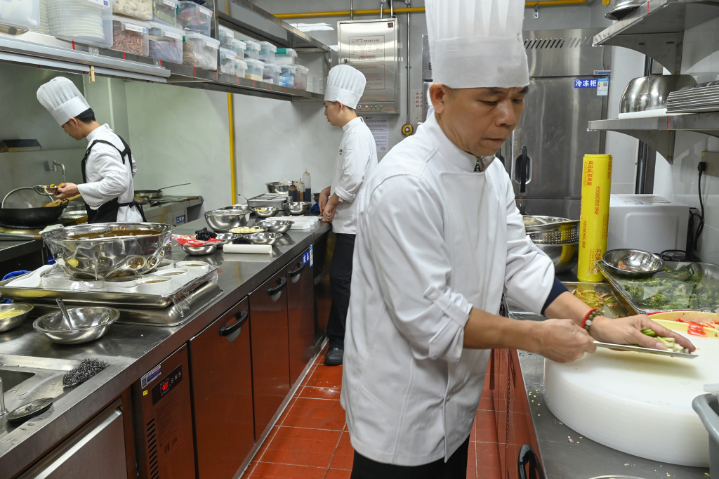 2026年1月22日,美达广场内的一家餐厅后厨,厨师正在切配菜。不少餐厅配有明厨亮灶,且使用明火烹饪。
