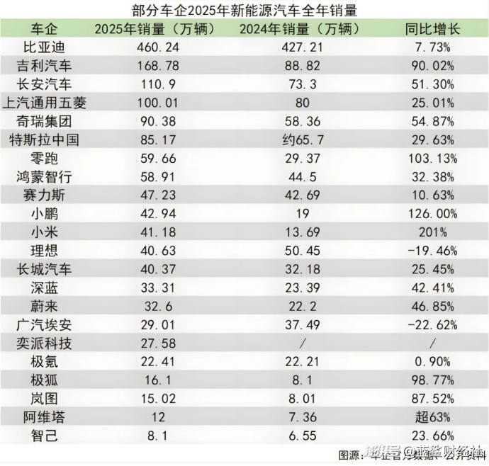 比亚迪遥遥领先,以460.24万辆的全年销量蝉联冠军,其中纯电车型销量225.7万辆,超越特斯拉成为全球纯电冠军。其高端品牌矩阵也表现亮眼:方程豹系列全年销量23.46万辆,同比暴涨316%,腾势品牌也持续收割高端市场份额。
