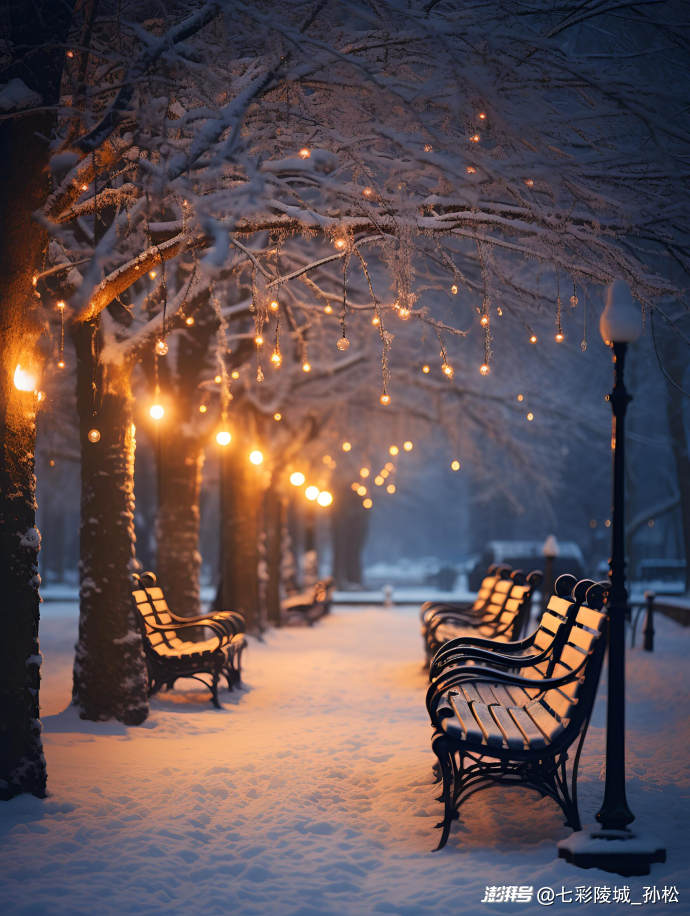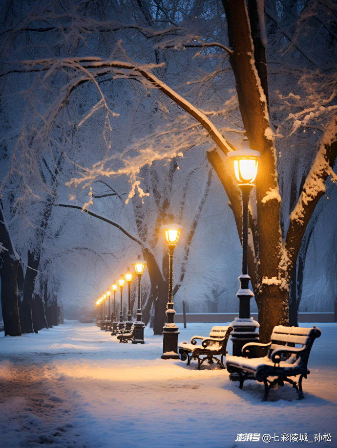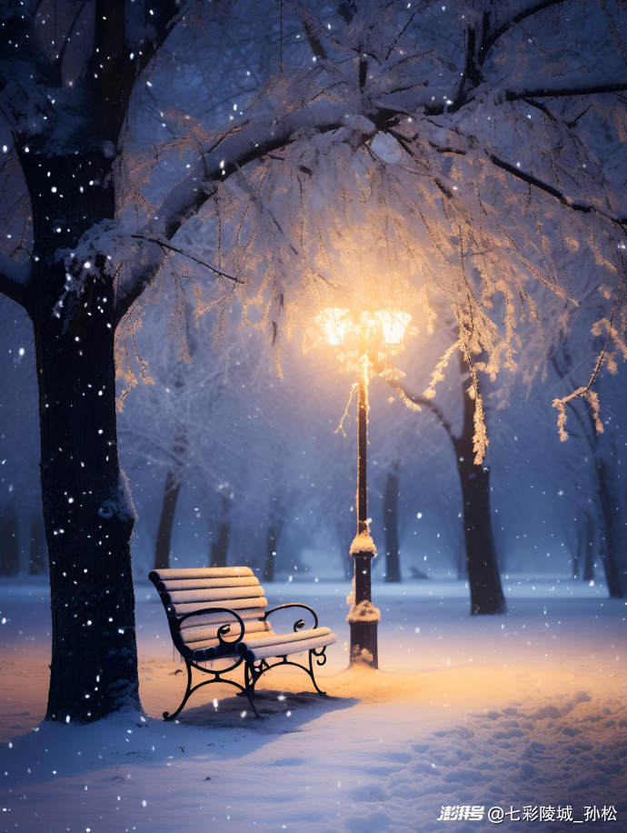 我忍不住推开窗,冷冽的空气裹着雪花的清甜涌进来。路灯的光此刻成了最温柔的舞台,每一片雪花都成了主角——它们落在灯罩上,积成薄薄的一层白纱;落在路边的长椅上,给木条缝里填满柔软;甚至有一片调皮地钻进我的衣领,凉丝丝地贴着后颈,惹得我缩了缩脖子笑起来。